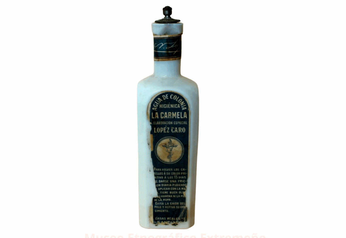 Para el mes de febrero hemos seleccionado un frasco de opalina blanca que contenía agua de colonia de nombre La Carmela. De base cuadrada presenta en el frontal una etiqueta de texto blanco sobre fondo verde en la que se especifica el contenido: AGUA DE COLONIA HIGIÉNICA LA CARMELA; el fabricante: LÓPEZ CARO; indicación del producto: Para volver los cabellos a su color primitivo a los 15 días de darse una fricción diaria pudiéndose aplicar con la mano, tiene buen olor, no mancha ni la piel ni la ropa. Evita la caída del pelo y activa su crecimiento.