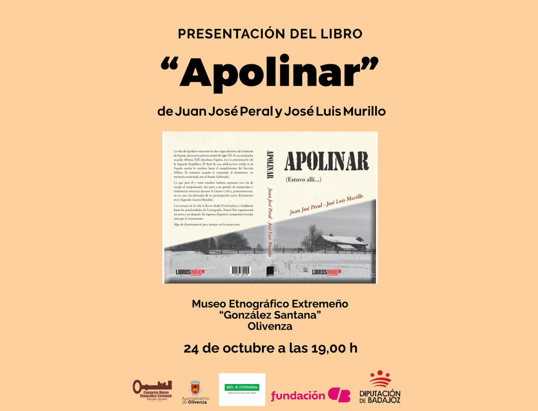 El próximo 24 de octubre, a las 19,00 horas, en la planta baja de la Torre del Homenaje tendrá lugar la presentación del libro Apolinar( estuvo allí…), escrito por Juan José Peral, nacido en Badajoz, pero con ascendencia directa en Olivenza, y José Luis Murillo, natural de Villanueva de la Serena, publicado por la editorial LIBOSINDIE
